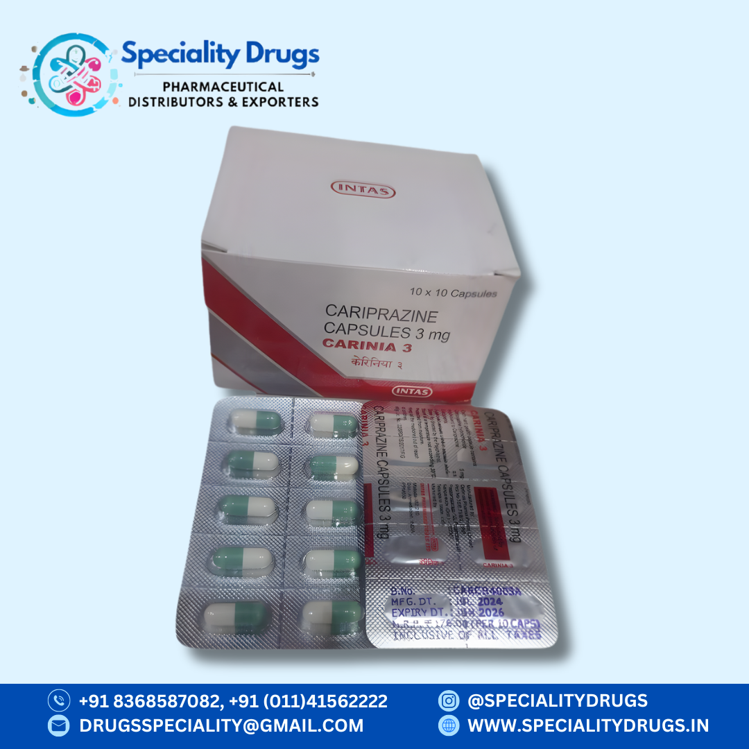 Carinia 3 is a prescription medicine that contains Cariprazine 3 mg, an atypical antipsychotic medication used for the treatment of mental health conditions such as schizophrenia and bipolar disorder. It works by balancing certain natural chemicals in the brain, mainly dopamine and serotonin, which play an important role in mood regulation, behavior control, and thinking ability.