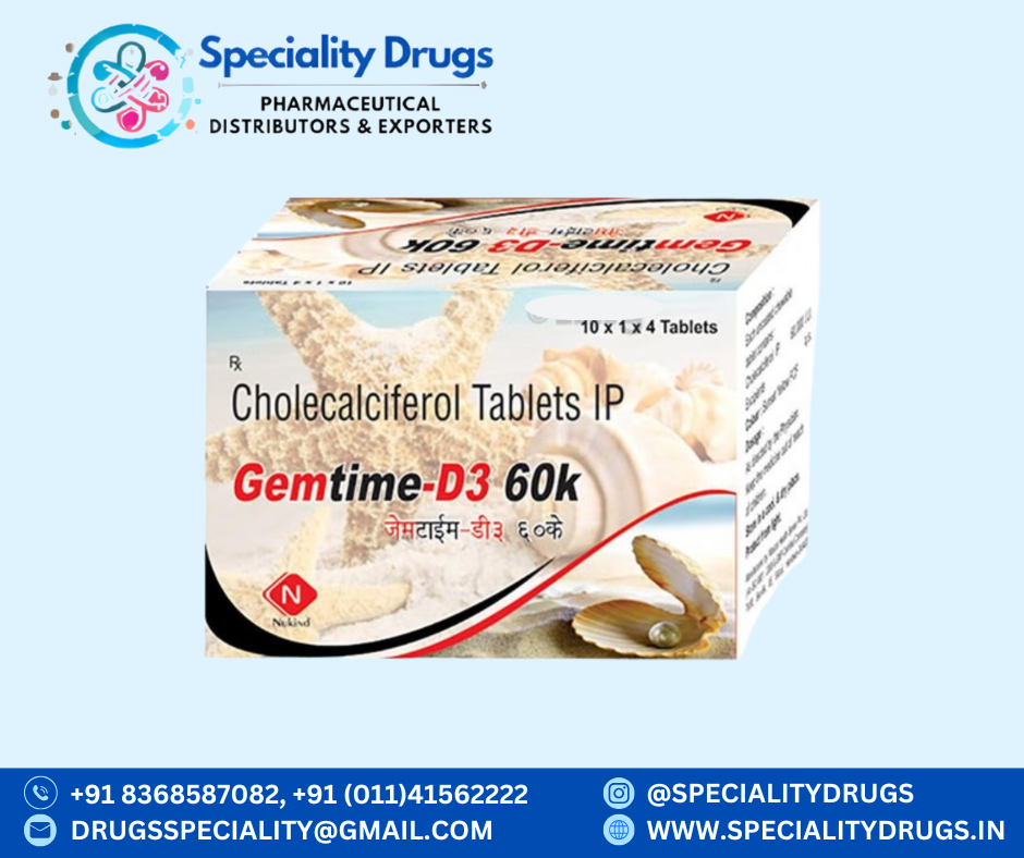 GEMTIME-D3 60K is a vitamin D3 supplement containing cholecalciferol, used to treat and prevent vitamin D deficiency and maintain healthy bones and calcium levels.